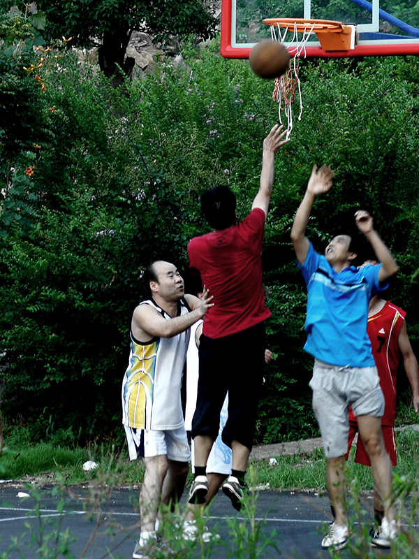 早晨,,小区蓝球场上几个人在打球,这位队员不惜犯规用手去推攻蓝的对手.手持百微抓拍